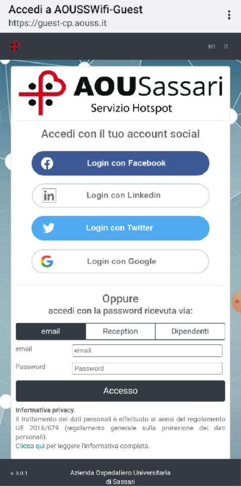 Una volta identificata e scelta la rete sul proprio dispositivo, l’utente può registrarsi utilizzando la pagina di autenticazione: https://guest-cp.aouss.it/home.