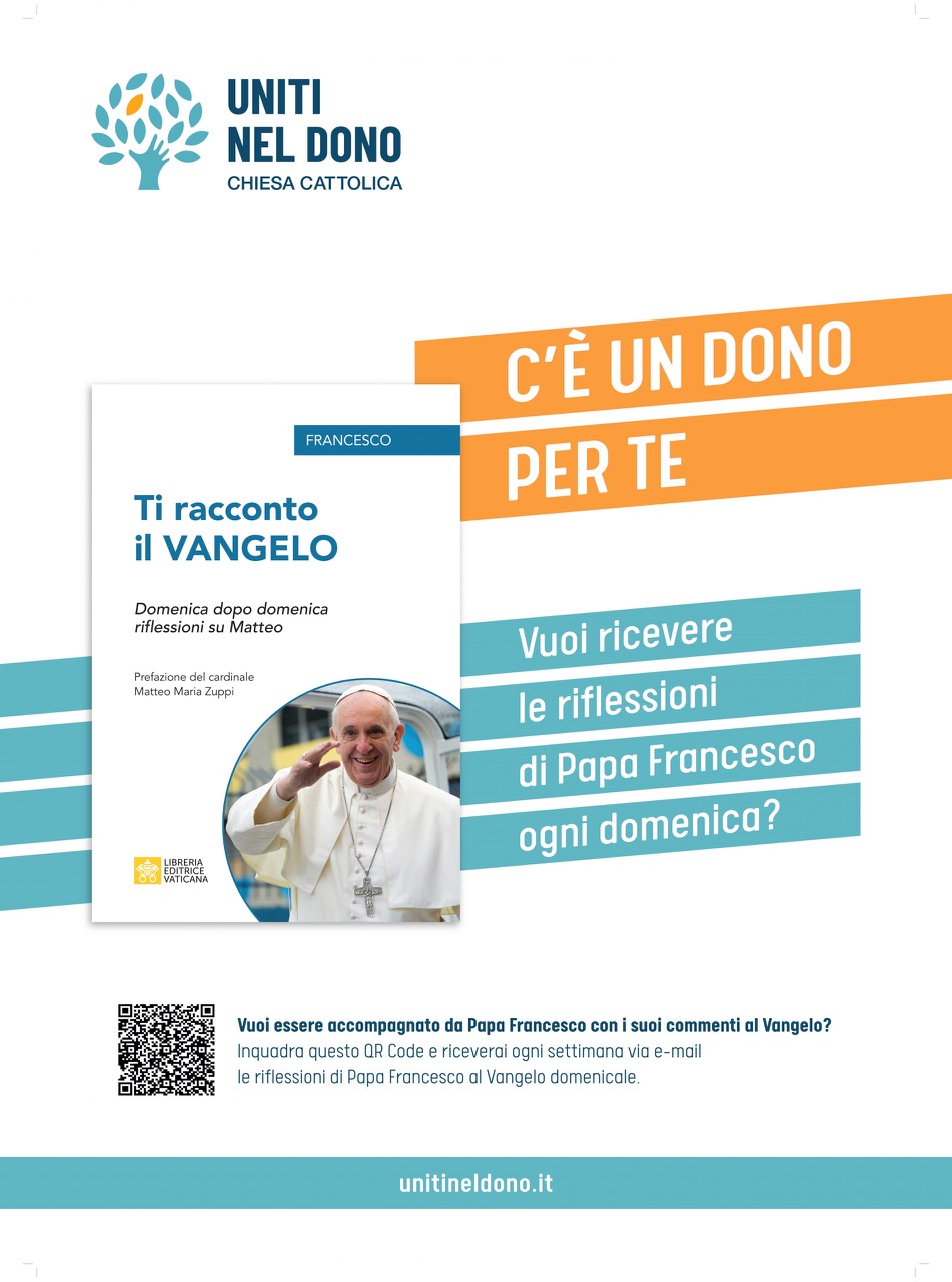 In occasione della Giornata del 17 settembre in ogni parrocchia i fedeli troveranno locandine e materiale informativo per le donazioni ed avranno la possibilità di ricevere un “dono speciale”: le riflessioni di Papa Francesco. Basterà inquadrare il Qr code, presente sulla locandina con l’immagine del Santo Padre e lasciare i propri dati per ricevere via e-mail ogni settimana i commenti del Papa al Vangelo.
