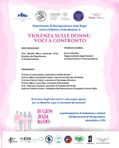 Sassari. Giovedì 11 gennaio alle 16.00, nell’Aula Segni del Dipartimento di Giurisprudenza dell’Università degli Studi di Sassari in viale Mancini 5, si terrà la conferenza “Violenza sulle donne: voci a confronto”.