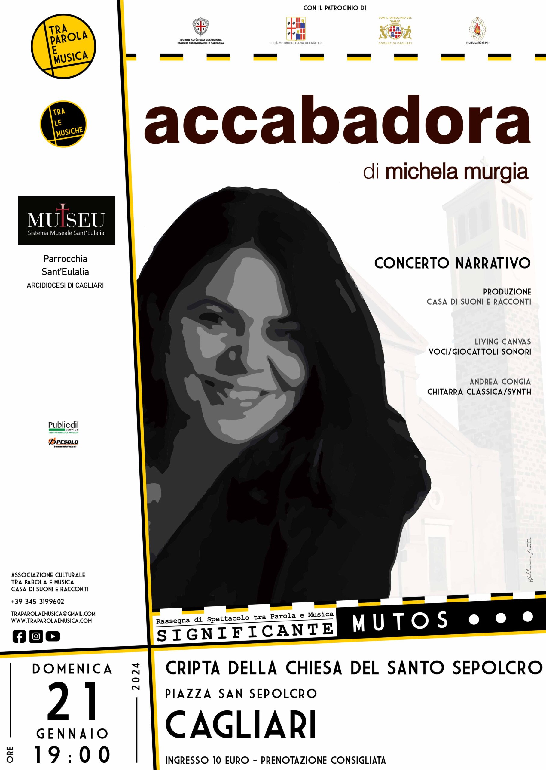 ACCABADORA DI MICHELA MURGIA – Nel mese di Gennaio la Casa di Suoni e Racconti proseguirà il suo impegno artistico nella creazione di un dialogo tra le Arti con la diciassettesima edizione della Rassegna di Spettacolo tra Parola e Musica – SIGNIFICANTE, quest’anno intitolata MUTOS. Dopo “Pagine di Significante – Silloge Scenica dedicata alla Sardegna”, la Rassegna proseguirà con lo spettacolo “Accabadora” di Michela Murgia. Domenica 21 Gennaio 2024 alle ore 19:00, la Cripta della Chiesa del Santo Sepolcro (Piazza San Sepolcro – Cagliari) ospiterà un Concerto Narrativo in cui Parola e Musica daranno voce e atmosfere sonore ad un’antologia tratta dal romanzo della Scrittrice Sarda recentemente scomparsa. La performance proposta vedrà in scena le voci del Living Canvas (per l’occasione composto da Anna Brotzu, Piera Demurtas, Daniela Loi Lobina, Carla Oro, Giorgia Sarigu e Francesca Serra) e le chitarre del musicista Andrea Congia