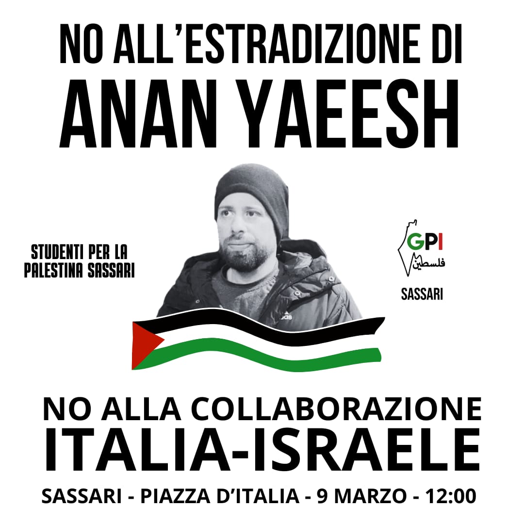L’intento è «fare pressione sul governo e sullo stato italiano – spiegano lo scrittore Filippo Kalomenidis e gli Studenti di Assemblea per la Palestina Sassari – per impedire che Anan Yaeesh, recluso nel carcere di Ancona, venga estradato nelle carceri israeliane, dove sono rinchiusi migliaia di prigionieri politici, tra cui centinaia di bambini, come riportato da Amnesty International».