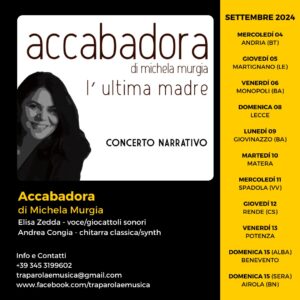 I PARTNER – Il tour dello Spettacolo è allestito dalla Casa di Suoni e Racconti in stretta collaborazione e con il sostegno di numerosi partner tra i quali CapitalSud APS e l’Officina San Domenico di Andria (BT), la Cooperativa Sociale Open e il Parco Turistico Culturale Palmieri di Martignano (LE), il Circolo Arci Contrada100, l’A.N.P.I. – Sezione “Lidia Menapace”, l’Organizzazione Giovanile Articolo 18 e l’Associazione Ludica 99 Corsarsi di Monopoli (BA), Tagliatelle – Stazione Ninfeo di Lecce, il Circolo Arci Tressett 37 e il Bar Crêuza de mä di Giovinazzo (BA), il Ristorante Lùcany di Matera, il Comune, Radici Selvatiche e Villa Rosa di Spadola (VV), il Nucleo Kubla Khan e il Circolo Arci Aprile CavernClub di Cosenza, il Piccolo Teatro Gulliver di Rende (CS), l’Associazione Insieme Onlus di Potenza, il Balletto di Benevento e l’Associazione Textures di Airola (BN). Il concerto narrativo Accabadora di Michela Murgia è parte integrante della programmazione artistica annuale della Casa di Suoni e Racconti, patrocinata dalla Regione Autonoma della Sardegna e sostenuta anche dalla Fondazione di Sardegna. A supporto del programma è stata attivata una campagna di crowdfunding sulla piattaforma buonacausa.org (buonacausa.org/cause/tra-le-musiche-2024)