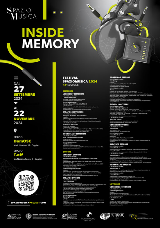 IL FESTIVAL – L’Associazione Spaziomusica è stata fondata nel 1982 da Franco Oppo, compositore e musicista di fama internazionale, e da allora è una realtà riconosciuta e accreditata nel panorama musicale regionale e nazionale italiano. Alcuni numeri che raccontano la lunga carriera di Spaziomusica: più di cinquecento concerti eseguiti, duecento complessi ospitati e circa trecento fra direttori e solisti di livello internazionale che hanno proposto circa mille cinquecento composizioni firmate da oltre seicento compositori del Novecento e contemporanei, di cui oltre trecento in prima esecuzione assoluta e oltre duecento in prima esecuzione italiana, trentasette edizioni del Festival che oltre a Cagliari interessa diversi altri centri dell’isola e che ha portato in Sardegna nomi prestigiosi del panorama nazionale ed internazionale. L’attività di Spaziomusica, festival attivo nella scena sarda da quattro decenni, intende continuare la sua esplorazione nel campo del sonoro contemporaneo. Esplorazione che a partire dal segno della musica scritta e dal suono di quella improvvisata si allarga fino al risonante ad include il paesaggio sonoro di oggi generando una visione fantastica del nostro abitare il mondo. Questa visione si mostra nelle nuove produzioni musicali, nei laboratori e nelle attività didattiche e viene tematizzata nei suoi convegni e seminari. Non mancano i riferimenti alle particolarità sonore della Sardegna legate sia alla lingua che al paesaggio naturale esplorate in progetti specifici. L’attività dell’anno 2024 prevede la realizzazione di produzioni originali che si propongono di esplorare il campo della musica d’avanguardia e le sue innumerevoli escursioni. Escursioni multimediali, ma anche escursioni che più profondamente sconfinano e interagiscano con altri linguaggi espressivi, come il movimento corporeo e la gestualità, la perizia solista, il mondo delle immagini.