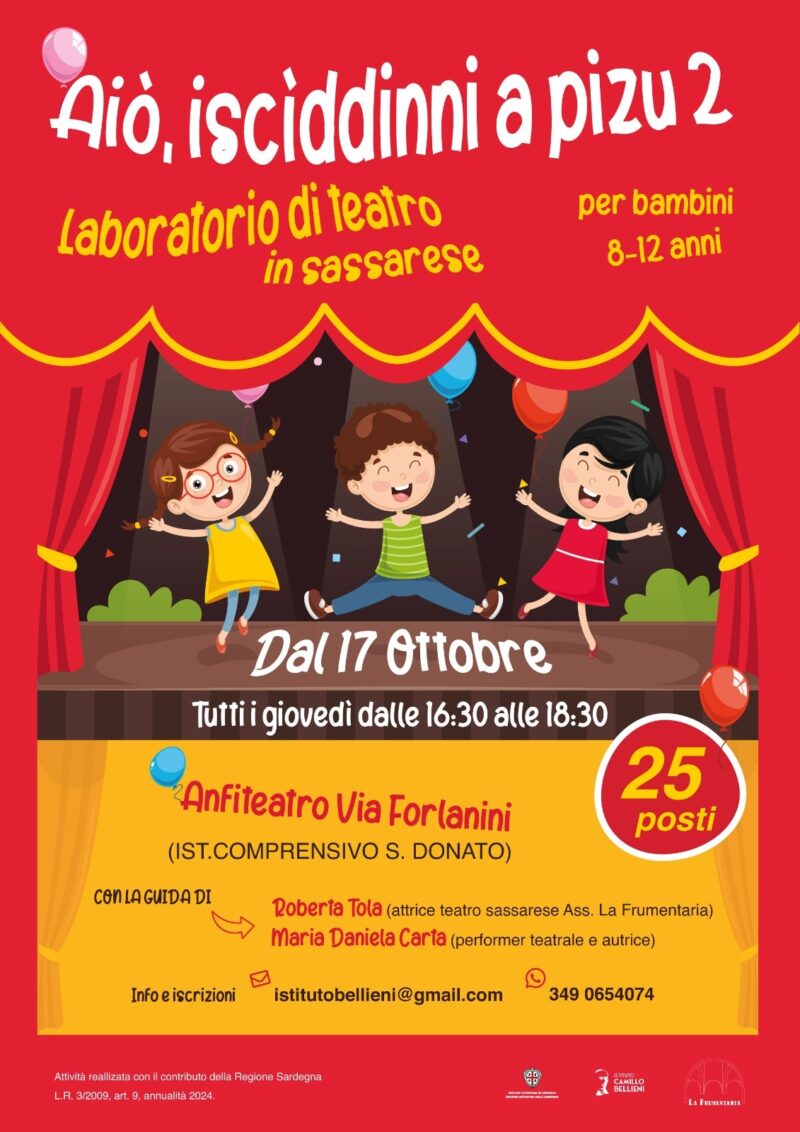 Sassari. Il laboratorio di teatro in sassarese per bambini “Aiò, iscìddinni a pizu” avrà la sua seconda edizione nel 2024 a partire dal 17 ottobre, con appuntamento tutti i giovedì dalle 16.30 alle 18.30 all’Anfiteatro di via Forlanini (Istituto comprensivo di San Donato) a Sassari.
