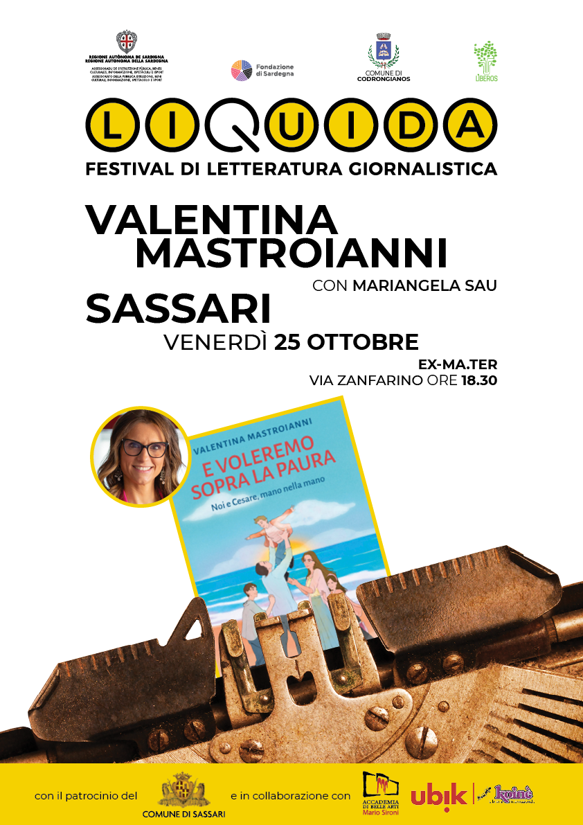 Sassari. Proseguono gli eventi in appendice al festival Liquida, organizzato dal Comune di Codrongianos con Lìberos: venerdì 25 ottobre, Valentina Mastroianni presenterà a Sassari il suo libro “E voleremo sopra la paura”, edito da De Agostini. Con l’autrice dialogherà Mariangela Sau. Appuntamento alle 18.30 all’Ex-Ma.Ter.