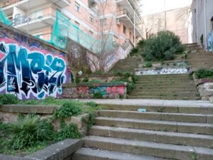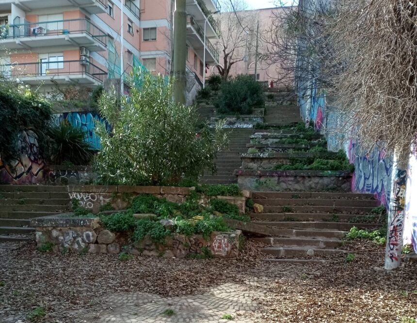Il dato di cronaca è semplice: via Adelasia (“Giudicessa sec. XIII”, precisa la targa), la doppia scalinata con al centro un rettilineo alberato nel Fosso della Noce, tra via Principessa Jolanda e viale Umberto, è inguardabile.