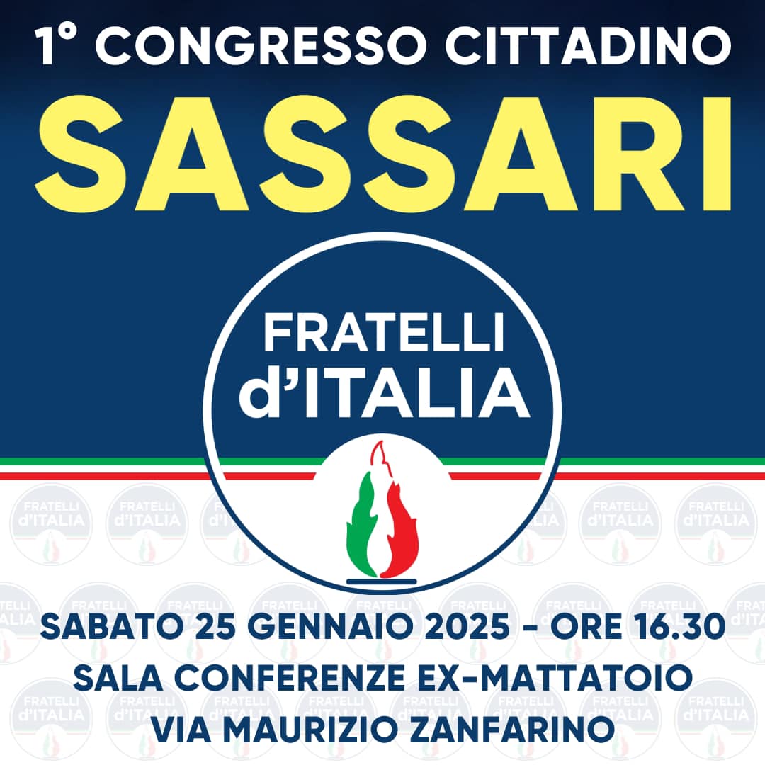 Sassari. Fratelli d’Italia Sassari terrà il suo 1°Congresso Cittadino sabato 25 gennaio p.v. alle ore 16,30, presso i locali dell’ ExMa in via Maurizio Zanfarino; nell’occasione si procederà all’elezione del nuovo Coordinatore cittadino e dei componenti del Coordinamento stesso.