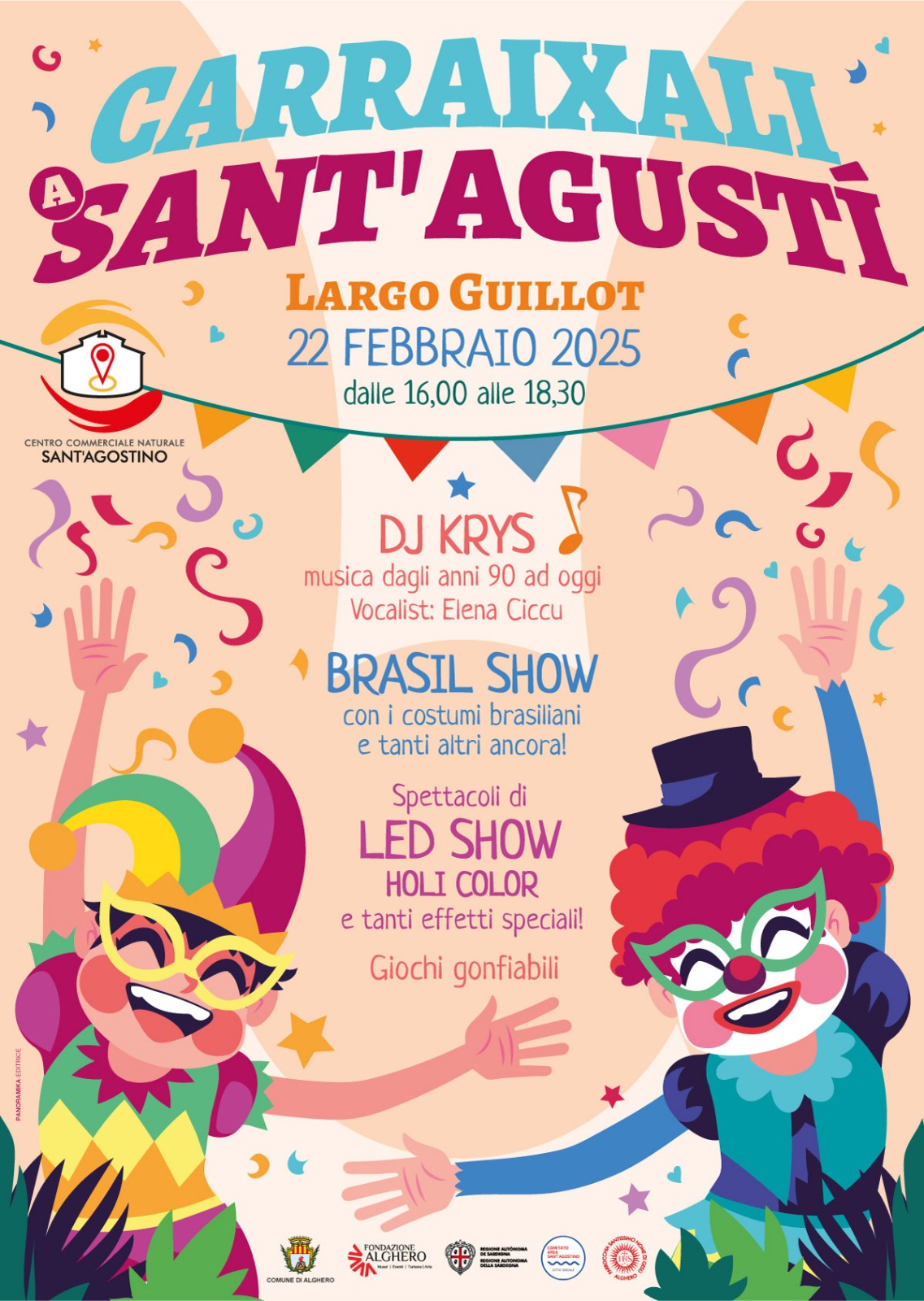 Organizzato dall’attivissimo Centro Commerciale Naturale Sant’Agostino, con la collaborazione del Comitato Area e della Parrocchia Santissimo Nome di Gesù, il “Carraixali a Sant’Agustì” è una festa pensata per il divertimento dei più piccoli, ma anche per coinvolgere un pubblico adulto, passando da momenti di allegria e svago alla riscoperta della tradizione culinaria e della cultura carnevalesca.