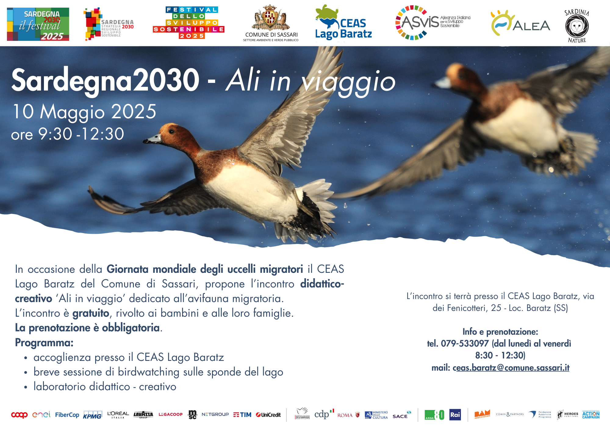Sassari. Il 10 maggio dalle 9:30 alle 12, in occasione della Giornata mondiale degli uccelli migratori, il CEAS Lago Baratz del Comune di Sassari, che svolge le sue attività didattiche nella Z.S.C. (Zone Speciale di Conservazione) ‘Lago Baratz-Porto Ferro’, propone il laboratorio didattico-creativo ‘Ali in viaggio’ dedicato all’avifauna migratoria. I partecipanti, per un massimo di 20 tra bambine e bambini, accolti dalle operatrici nella sede del Ceas Lago Baratz, dopo una presentazione sugli uccelli migratori, saranno accompagnati sulle sponde del lago per una breve sessione di birdwatching; al rientro, nelle aule del Ceas, saranno coinvolti in un laboratorio creativo a tema durante il quale potranno costruire il loro piccolo migratore.