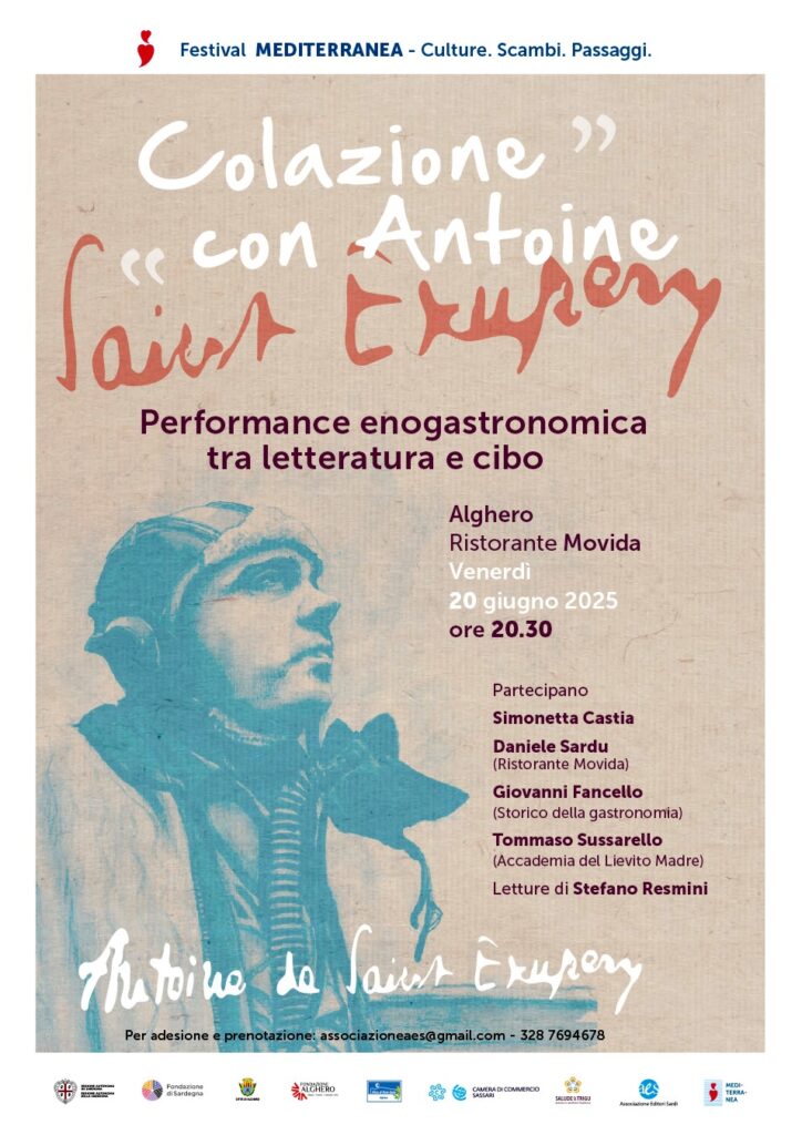 Venerdì 20 giugno alle 20.30 al ristorante Movida, ai Bastioni Magellano, è previsto l’incontro gastronomico-letterario su prenotazione “Colazione con Antoine de Saint-Exupéry”, ispirato alle frequentazioni algerine del pilota e autore del celebre racconto Il piccolo principe, rivisitazione di un celebre convito organizzato il 28 maggio del 1944 nella baia di Porto Conte. Gli organizzatori declinano una proposta che spazia dalla tradizione berbera a quella sarda, lungo un connubio basato sulla contaminazione e lo scambio tra diverse culture mediterranee. All’incontro, inserito nella sezione “Menu letterari. Cultura mediterranea e cibo”, che ha come elemento ispiratore il rapporto tra la letteratura e la mediterraneità delle tradizioni enogastronomiche, parteciperanno la presidente AES Simonetta Castia, Daniele Sardu del ristorante Movida, lo storico della gastronomia Giovanni Fancello e Tommaso Sussarello dell’Accademia del Lievito Madre. Durante la serata saranno proposte delle letture a cura di Stefano Resmini. Per partecipare alla serata, esclusivamente su prenotazione, è necessario scrivere alla mail associazioneaes@gmail.com o chiamare il numero 3287694678.