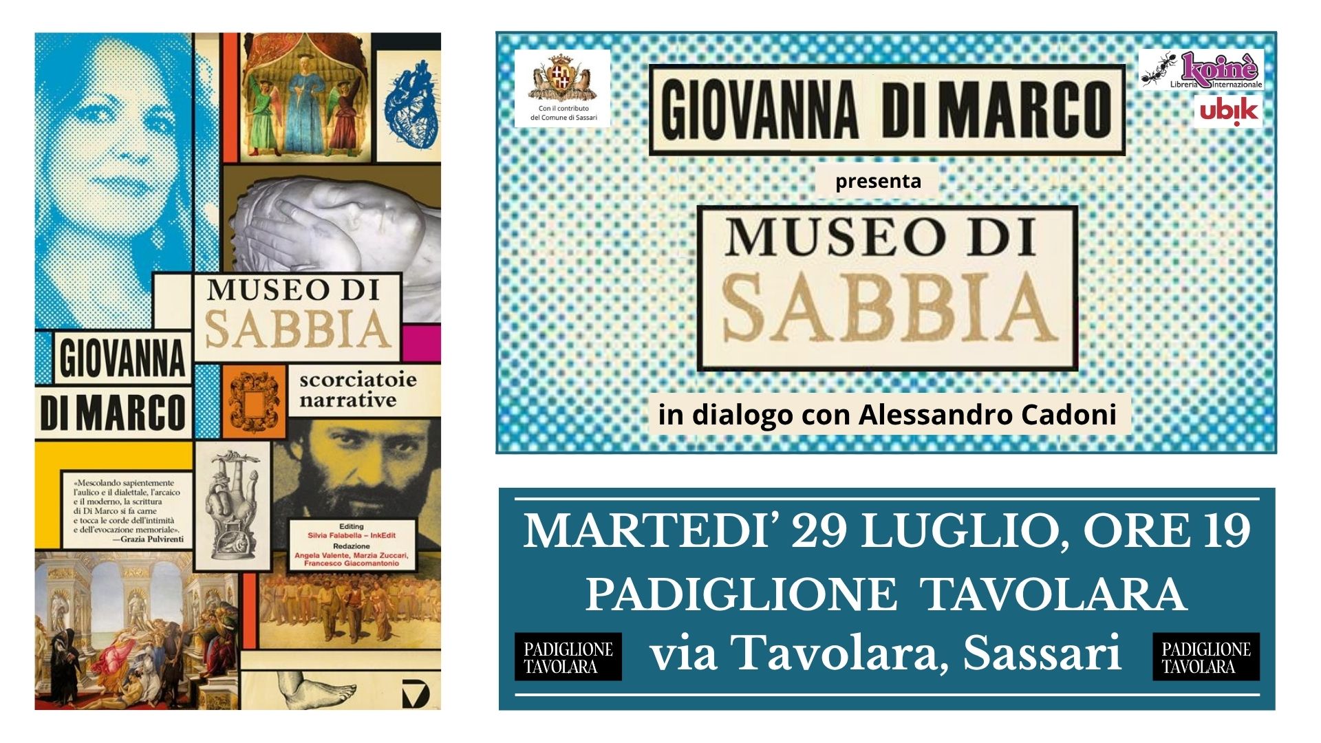 Sassari. Martedì 29 luglio, alle ore 19, il Padiglione Tavolara di Sassari ospiterà la presentazione del libro Museo di sabbia. Scorciatoie narrative (Nutrimenti) della scrittrice Giovanna Di Marco. A dialogare con l’autrice sarà Alessandro Cadoni.