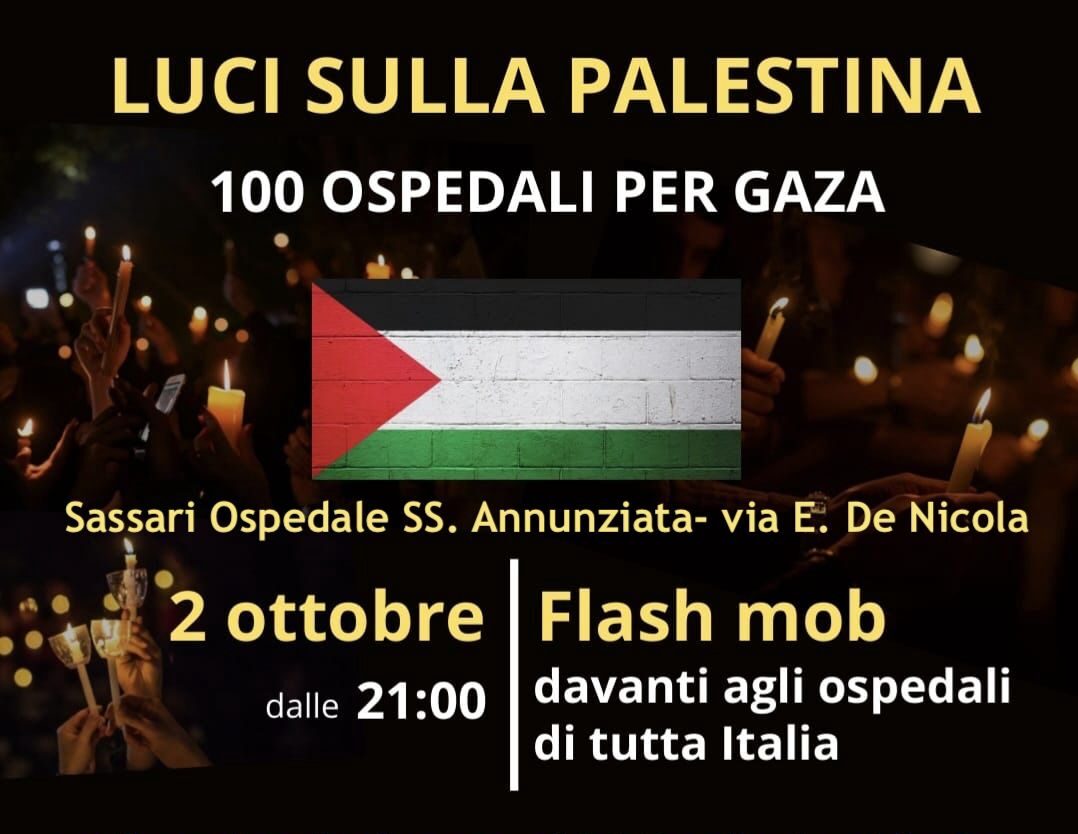 Sassari. Giovedì 2 ottobre, a partire dalle ore 21, anche Sassari parteciperà all’iniziativa nazionale “Luci sulla Palestina – 100 ospedali per Gaza”, un momento di raccoglimento e solidarietà che si svolgerà davanti a tutti ospedali d’Italia.